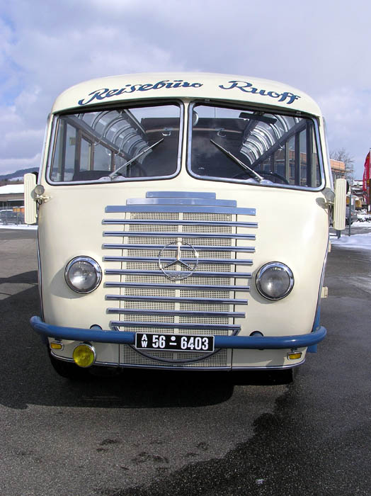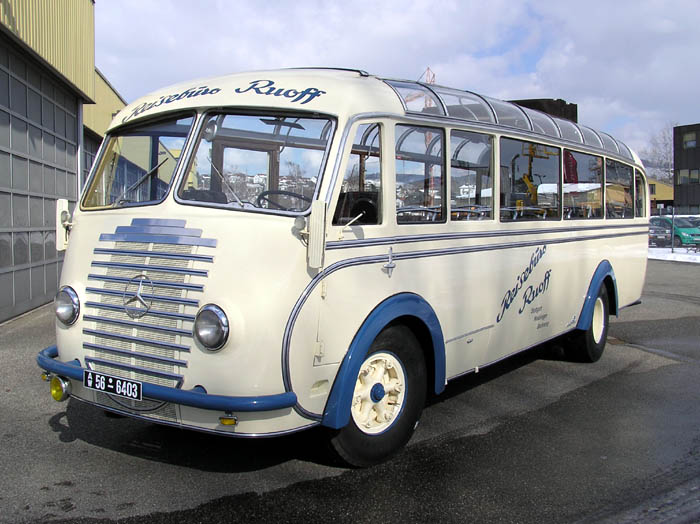 Der mittlerweile liebevoll restaurierte Oldtimer ist vom Typ OP 3750. Das Fahrgestell von Mercedes Benz wurde ca. 1940 gebaut. Die Karosserie, also der Aufbau, stammt von der Firma Gottlob Auwärter jun. aus dem Jahr 1948. Nach dem Krieg wurde der Bus von der amerikanischen Besatzungsmacht beschlagnahmt. Im Jahr 1946/47 kaufte Richard Ruoff das Fahrzeug zurück und ließ es von der Firma Auwärter mit einem neuen Aufbau versehen. Es entstand der schmucke Reisewagen mit Faltschiebedach und Heckgepäckraum, wie er heute wieder zu sehen ist. Doch das Fahrzeug glänzte nicht durchgehend so schön. Nachdem der Reisewagen den Ansprüchen im Reiseverkehr nicht mehr genügte, setzte ihn die Fa. Ruoff in den 50er Jahren im Linienverkehr ein. Doch auch von dort wurde er bald aus dem Verkehr gezogen und an einen Cannstatter Gebrauchtwagenhändler verkauft.