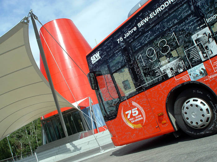 In diesem Zusammenhang entstand eine ganz besondere Idee: Anlässlich des 75-jährigen Firmenjubiläums von SEW EURODRIVE - Weltmarktführer für Antriebstechnik - wurde ein Stadtbus komplett umgestaltetet und zunächst mit Texten und Bildern, die die Chronik des erfolgreichen Unternehmens schematisch nachstellen, in den Verkehrsbetrieb geschickt. Während der Jubiläumsfeier wurde dann der EvoBus MB O 530 (Citaro) mit dem Kennzeichen KA-SB 690 inmitten des Veranstaltungsgeländes geparkt und diente den Mitarbeitern als riesengroßes Gästebuch. Als Garant für den Erfolg sollte jeder der 3.000 Mitarbeiter den Bus handschriftlich signieren. Das Ergebnis in Form eines der wohl originellsten und individuellsten Bus-Beschriftungen beweist die große Freude, die die Mitarbeiter während ihrer Feier und beim Signieren hatten. Ein Stadtbus mit einer derart großen Zahl von Mitarbeiterunterschriften eines ortsansässigen Weltunternehmens schafft eine Identifikation, die wohl nicht zu übertreffen ist.