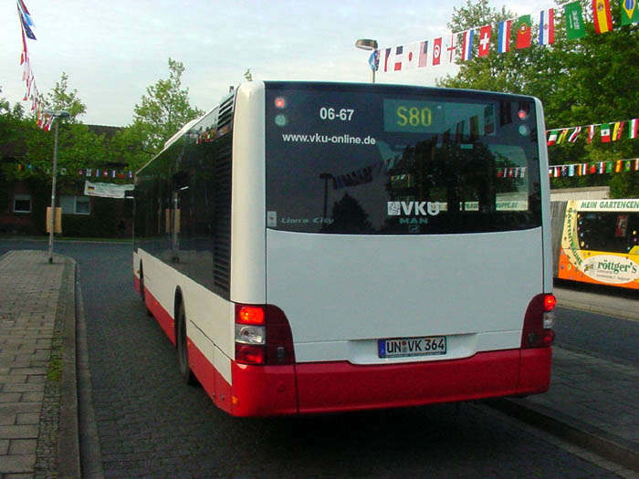 Seit Mai 2006 läuft bei der VKU in Kamen die Ersatzbeschaffung für den Wagen 94-64 (Mercedes-Benz O405 N2), der mit Getriebeschaden verkauft worden ist. Es handelt sich um einen MAN A37 (NL 283) mit Supersingle-Reifen auf der Hinterachse, der ursprünglich für die Hamburger Hochbahn AG vorgesehen war. Das als Wagen 06-67 eingereihte Fahrzeug verfügt über drei Türen, eine Klimaanlage und CRT-Filter. Während statt der großen Heckzielanzeige nur eine Liniennummernanzeige eingebaut wurde, wird der Wagen nach der Fußball-Weltmeisterschaft noch die VKU-Lackierung und neue Sitzpolster erhalten. Die Aufnahmen zeigen das Einzelstück am Bahnhof Kamen.