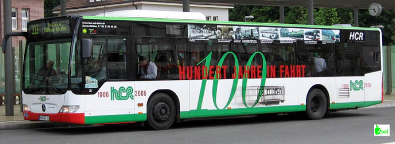 Eigenwerbung zu diesem Jubiläum macht die HCR mit dem abgebildeten Wagen 28, einem EvoBus MB O 530 (Citaro), der neben dem Hinweis auf die "hundert Jahre" zusätzlich beiderseits an den Dachkanten Bilder ihrer Geschichte mit Kurzbeschreibungen angebracht hat.