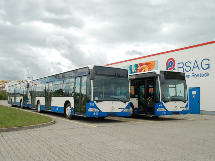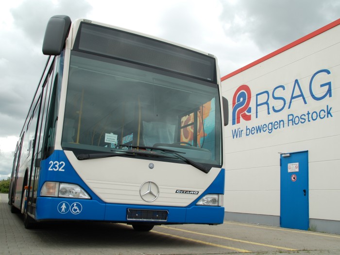 Zur weiteren Verstetigung des Busfuhrparks der Rostocker Straßenbahn AG (RSAG) trafen am Nachmittag des 30.05.2006 die für dieses Jahr bestellten Omnibusse ein. Fünf Gelenk- und zwei Solobusse vom Typ EvoBus MB Citaro wurden durch eine Spedition aus dem EvoBus Werk in Mannheim überführt. Die Fahrzeuge verfügen über Euro III-Dieselmotoren mit CRT-Filter, die den Feinstaubausstoß drastisch reduzieren. Im Innen- und Außenbereich kommen LED-Anzeigen in "Bernsteinklar" der Firmen Mobitec sowie LAWO zum Einsatz. Bevor die Fahrzeuge jedoch in den laufenden Verkehr übergehen, wird in eigener Werkstatt eine Videoüberwachungsanlage eingebaut um Vandalismusschäden vorzubeugen.
