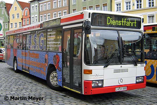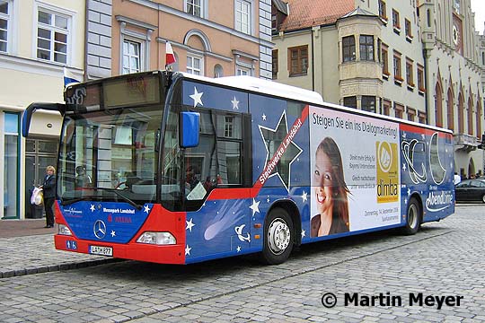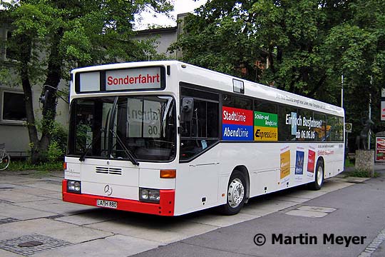 Als Nachtrag zur Meldung vom 06.06.2006 über das neue Liniennetz der Stadtwerke Landshut seien an dieser Stelle noch einige Bilder gezeigt. Wie bereits angekündigt, erhielten einige Omnibusse eine passende Beschriftung für die Abendlinien - so auch der Wagen 7536, ein EvoBus MB O 530 (Citaro), der auf den beiden linken Fotos zu sehen ist. Die im Jahre 1992 beschafften Mercedes-Benz O 405 N1 wurden inzwischen u.a. mit einer neuen Farbgebung sowie Matrix-Zielanzeigen grundlegend modernisiert, abgebildet ist der Wagen 7522. Der noch mit Rollband-Zielanzeigen ausgestattete Wagen 7513 diente Anfang Juni 2006 als Infobus für das neue "Optibus"-Konzept und ist schließlich auf dem ganz rechten Bild gezeigt.
