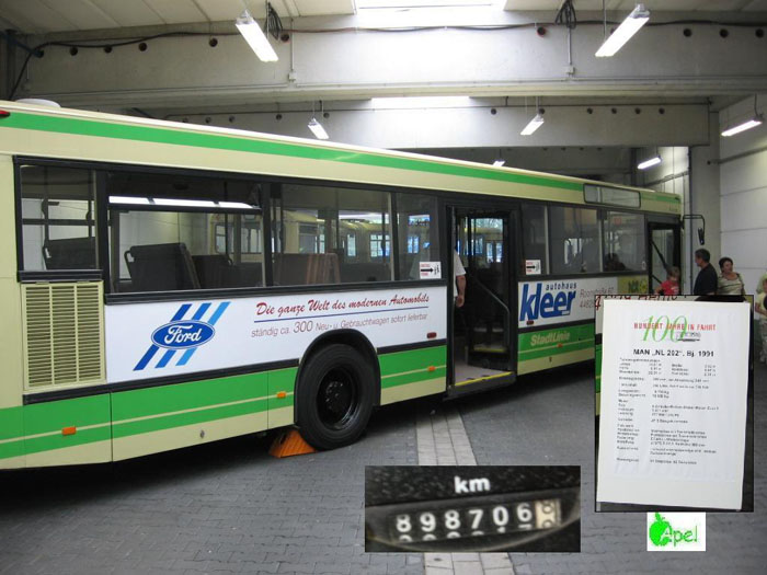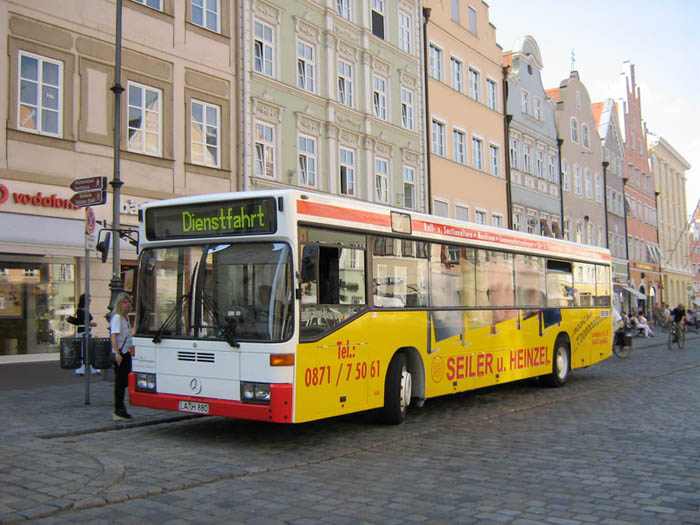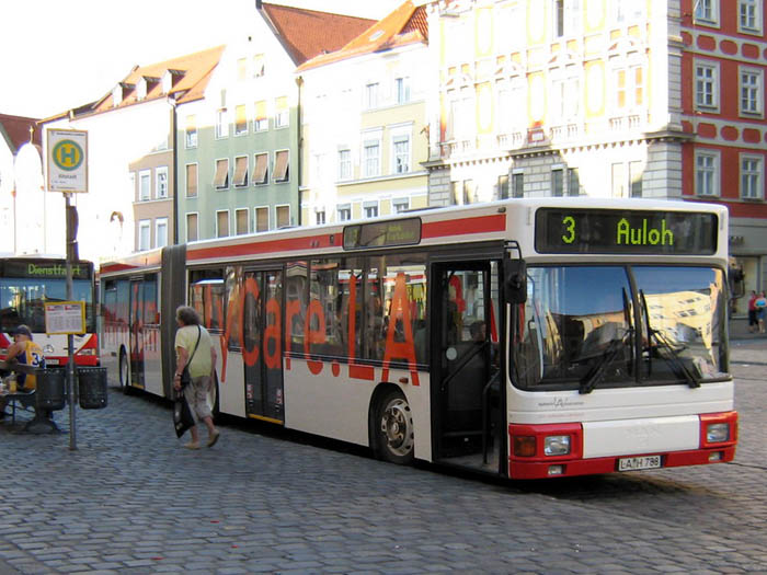 Bei den Stadtwerken Landshut wurden inzwischen alle Mercedes-Benz O 405 N mit Matrixanzeigen nachgerüstet und weitere Fahrzeuge überholt, d.h. neu lackiert, mit neuen Sitzbezügen im "Stadtdekor" versehen und neuen Werbefolien beklebt. Auch die zwei MAN A11 (NG 272) von 1993 (Wagen 7560 und 7561) wurden inzwischen mit einbezogen - das linke Bild zeigt den Wagen 7561 in noch nicht endgültigem Zustand. Auch der ehemalige Infobus 7513 ist nachgerüstet und mit neuer Reklame ausgestattet, wie in der rechten Aufnahme zu sehen ist.