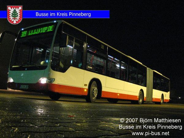 Die Kreisverkehrsgesellschaft in Pinneberg GmbH (KViP) mit Sitz in Uetersen haben im Dezember einen neuen EvoBus MB O 530 G (Citaro) in Dienst gestellt. Der Gelenkbus erhielt die Wagennummer 309 und das Kennzeichen PI-VK 309. Neben einem Euro 5-Motor verfügt der Wagen über eine Klimaanlage und die Überlandfront.
