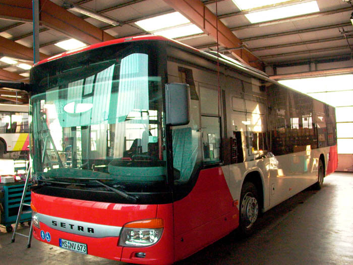 Die Aufnahmen zeigen den frisch abgelieferten Setra S 415 NF mit dem Kennzeichen WES-DB 704 der RVN in Wesel sowie den bereits aufgerüsteten Wagen MS-NV 673 gleichen Typs in der Werkstatt der WB in Münster.