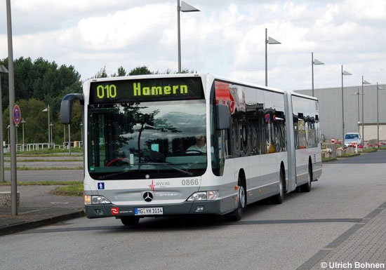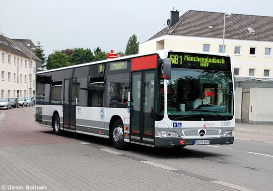 Aus der diesjährigen Beschaffung der Ausschreibungsgemeinschaft Mittlerer Niederrhein hat die Niederrheinische Versorgung und Verkehr AG (NVV) in Mönchengladbach acht EvoBus MB O 530 (Citaro) und sechs EvoBus MB O 530 G (Citaro) erhalten. Die Solowagen wurden als Wagen 0801 bis 0808 mit den Kennzeichen MG-YH 1001 bis 1008, die Gelenkbusse unter den Nummern 0861 bis 0866 mit den Zulassungen MG-YH 1009 bis 1014 in den Bestand eingereiht. Sämtliche Fahrzeuge verfügen über Motoren nach der EEV-Norm. Die Solowagen erhielten zusätzlich das Umweltsiegel "Blauer Engel", wofür die grauen Streifen der Lackierung mit Folien geklebt statt lackiert werden mussten. Die Aufnahmen von Ulrich Bohnen zeigen den Solowagen 0807 in Mönchengladbach-Wickrath und den Gelenkbus 0866 bei der Ankunft am Mönchengladbacher Flughafen.