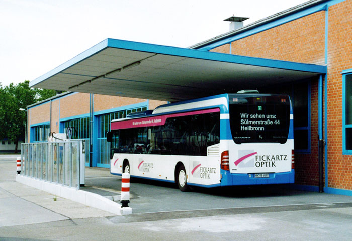 die Verkehrsbetriebe der Stadtwerke Heilbronn (SWH) nun einen gemeinsamen Betriebshof. Für die Verwaltung und das KundenCenter wurde am Verwaltungsgebäude der SWH ein Anbau errichtet, während für die Fahrzeuge der RBS das Betriebsgelände und die Werktstatt erweitert wurden. Die Bilder zeigen links das Gelände, auf dem seit Ende Juni die Busse der RBS abgestellt werden, kurz vor Abschluss der Bauarbeiten, sowie rechts die ausgebaute Tankstelle auf dem Betriebsgelände der Stadtwerke Heilbronn.