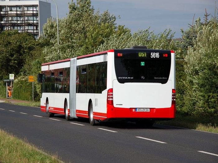 Die Stadtwerke Krefeld MOBIL GmbH (SWK) hat sieben EvoBus MB O 530 G (Citaro) in Dienst gestellt, die im Rahmen der Ausschreibungsgemeinschaft Mittlerer Niederrhein beschafft wurden. Die Gelenkbusse erhielten die Wagennummern 5611 bis 5617 und die entsprechenden Kennzeichen KR-ZH 11 bis 17. Bei den mit Motoren nach der EEV-Norm ausgestatteten Fahrzeugen handelt es sich um die ersten Citaro-Gelenkbusse der SWK. Die Aufnahmen von Ulrich Bohnen zeigen den Wagen 5614 zwischen Krefeld-Fichtenhain und -Stahldorf sowie den Wagen 5616 in Krefeld-Benrad.
