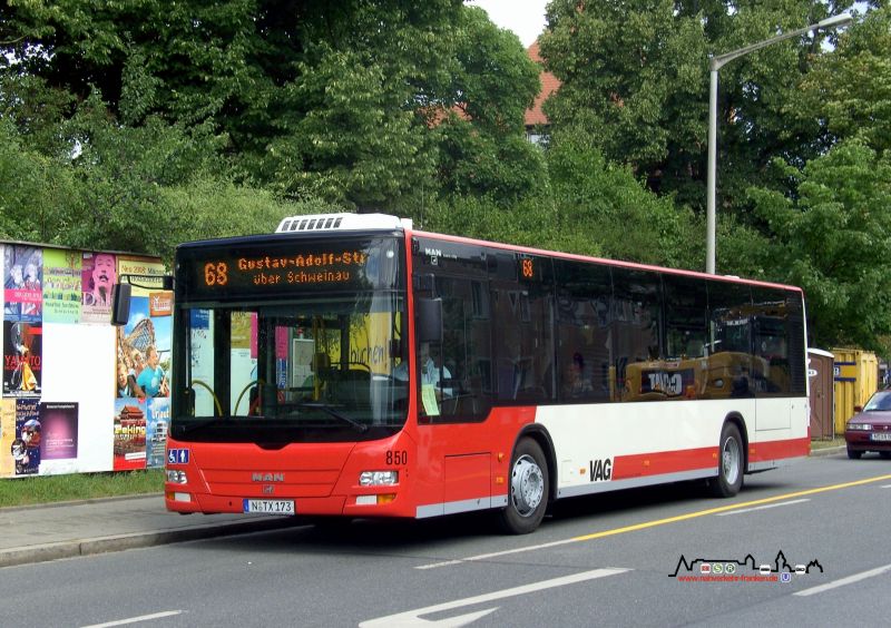 Bereits Ende Juni erhielt die Verkehrs-Aktiengesellschaft Nürnberg (VAG) weitere Neufahrzeuge. Nach den im Frühjahr gelieferten sechs Gelenkbussen gelangten nun noch acht Solobusse in den Fuhrpark. Bei diesen handelt es sich um MAN A37 (Lion's City) mit Turmmotor, die bereits die EEV-Abgasnorm erfüllen. Die Neufahrzeuge erhielten die Wagennummern 850 bis 857 und wurden im Juli auf folgende Kennzeichen zugelassen: