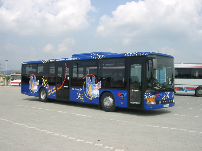 Abweichend vom üblichen RMV-Design erhielt der abgebildete Setra S 315 NF Wagen 214 eine sehr ansprechende Eigenwerbung für das gemeiname Nachtbusangebot von RMV und KEVAG in Koblenz. Der Bus wurde dazu bereits komplett blau lackiert geliefert.