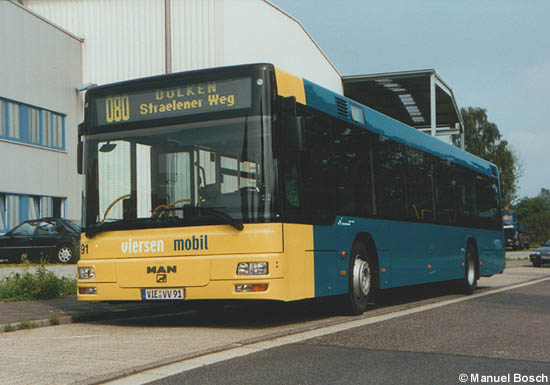 Die Niederrheinwerke Viersen mobil GmbH hat Mitte August zwei neue MAN A21 in Dienst gestellt. Dabei handelt es sich um einen NL 223, der die Wagennummer 91 und die Zulassung VIE-VV 91 erhielt, sowie einen NL 263, der als Wagen 93 bezeichnet und auf VIE-VV 93 zugelassen wurde. Während bei dem Wagen 91 erstmals in Viersen die Rundsitzecke im Heckbereich zur Anwendung kam, weist der Wagen 93 für den Einsatz auf der Schnellbus-Linie SB87 die Reihenanordnung sowie eine zusätzliche Sitzreihe vor dem Stehperron gegenüber Tür 2 auf. Beide Fahrzeuge erhielten eine Farbgebung in den neuen Unternehmensfarben der niederrheinwerke.
