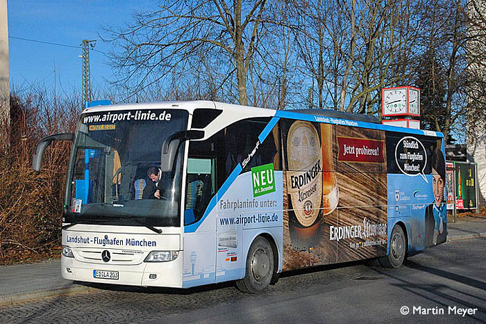 Am 01.12.2008 ging die neue von den Stadtwerken Landshut (SWL) gemeinsam mit der Firma Scharf aus Talheim betriebene Flughafen-Expresslinie zum Flughafen München in Betrieb. Sie wird von 4.00 bis 23.00 Uhr stündlich von der Altstadt und dem Hauptbahnhof mit noch zwei Zwischen-Haltestellen in Münchnerau und Moosburg (Autobahn) verkehren. Hierfür wurden eigens zwei neue EvoBus MB Tourismo Reisebusse zunächst für ein Jahr gemietet (oder geleast) und elf Fahrer befristet eingestellt. Für die Linie wurden eigene, auffällige neue Haltestellen-Schilder in blauer Farbe aufgestellt. Die beiden SWL-eigenen Busse haben inzwischen die Nummern 7401 und 7402 erhalten, ein weiteres Fahrzeug der Firma Scharf mit dem Kennzeichen ED-LA 203 läuft unter der SWL-Nummer 7403. Diesen Wagen zeigen die Aufnahmen von Martin Meyer am 14.12.2008 in Landshut.