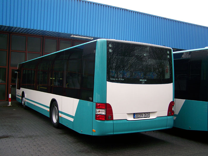 Bei der Rhein-Sieg Verkehrsgesellschaft mbH (RSVG) mit Sitz in Troisdorf sind die am 16.02.2009 gemeldeten Neufahrzeuge inzwischen zugelassen worden. Die zehn Gelenkbusse MAN A23 (NG 323 Lion's City) erhielten die Kennzeichen SU-BV 2606 bis 2615, die drei Solowagen MAN A21 (NL 283 Lion's City) die Zulassungen SU-BV 2616 bis 2618 und die beiden Überlandwagen MAN A20 (NÜ 283 Lion's City) die Kennzeichen SU-BV 2619 und 2620. Die Aufnahmen zeigen je einen Vertreter der Gelenk- und Solowagen auf dem Betriebshof in Hennef.