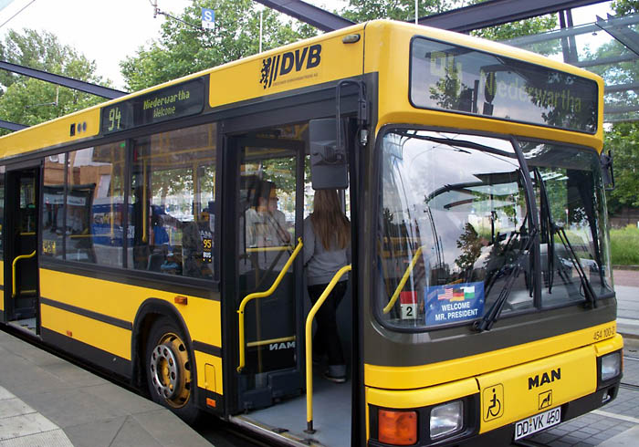 Die Dresdner Verkehrsbetriebe AG (DVB) machte auf eigene Weise auf den Kurzbesuch von US-Präsident Obama am 04. und 05.06.2009 in der sächsischen Landeshauptstadt aufmerksam. Alle Busse und Straßenbahnen trugen in der Frontscheibe ein Schild mit Begrüßungstext, welcher in Wechselschrift auch an der seitlichen Zielanzeige - dort statt der Fahrwegangabe - angezeigt wurde. Auf dem Foto ist der MAN A11 (NG 312) mit der Nummer 454 100-2 am Postplatz zu sehen.