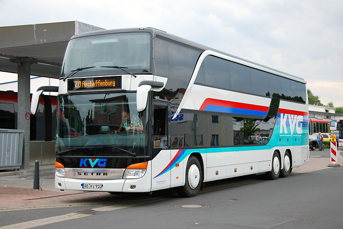 Die Meldung vom 26.05.2009 kann noch etwas ergänzt werden: Die beiden Setra S 431 DT-L Doppeldecker sind nicht völlig gleich. Während AB-KV 910 ein reiner "Linienwagen" ist, ist AB-KV 920 ein Kombibus, der auch für den Ausflugsverkehr gedacht ist. Im Gegensatz zu seinem Zwilling verfügt er auch über eine Küche und eine Toilette. Dennoch wird auch er vorwiegend im Linienverkehr eingesetzt. Die Aufnahme zeigt den AB-KV 910 am 18.06.2009 am Bahnhof in Schöllkrippen.