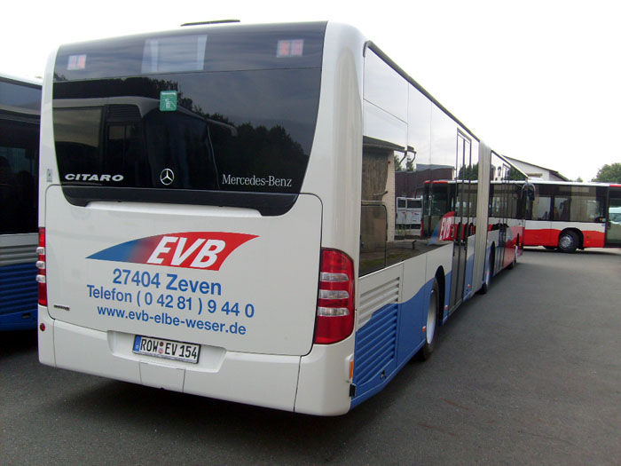 Die EVB Eisenbahnen und Verkehrsbetriebe Elbe-Weser GmbH mit Sitz in Zeven hat drei neue EvoBus MB O 530 GÜ (Citaro) erhalten. Sie wurden auf die Kennzeichen ROW-EV 153 und 154 sowie OHZ-VA 183 zugelassen. Letzteres Fahrzeug ist für das Tochterunternehmen von Ahrentschildt bestimmt.