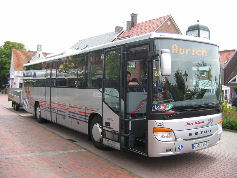 Bereits Ende letzten Jahres hat die Kreisbahn Aurich GmbH mit Wagen 43 (AUR-K 643) ihren insgesamt zweiten Setra S 415 UL (GF) erhalten. Im Bild rechts wartet dieses Fahrzeug am 21.07.2009 an der Haltestelle ZOB/Herdetor in Esens mit Fahrradanhänger auf seine Weiterfahrt nach Aurich.