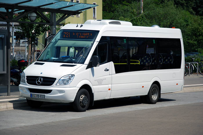 Einen für einen Tochterbetrieb von DB Stadtverkehr eher ungewöhnlichen Bus stellte die Regionalbus Braunschweig GmbH (RBB) Ende 2008 in Dienst. Es handelt sich um einen Mercedes-Benz 515 CDI Sprinter City 65, der auf das Kennzeichen BS-RB 810 zugelassen worden ist. Ungewöhnlich ist nicht nur der Fahrzeugtyp, sondern auch die Lackierung in schlichtem Weiß anstelle des 2008 eigentlich längst üblichen Verkehrsrots. Mein Foto zeigt den Wagen am Bahnhof in Wolfenbüttel. Er erreichte diese Station auf Linie 731 und fuhr als Linie 710.