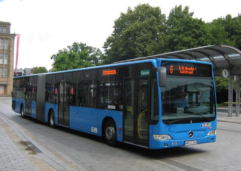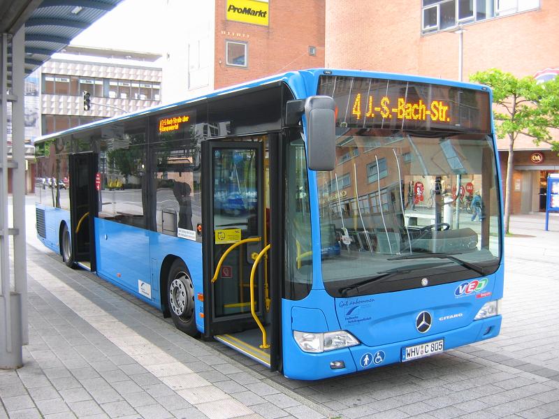 Noch Ende letzten Jahres hat die Stadtwerke Verkehrsgesellschaft Wilhelmshaven GmbH drei neue Mercedes-Benz Citaro in Dienst gestellt. Dabei handelt es sich um zwei Gelenkbusse EvoBus MB O 530 G (einer davon ist Wagen 803) und einen Solowagen O 530 (Wagen 805). Auffällig sind die recht kleinen Zielschilder vorne. Die Aufnahmen zeigen die beiden neuen Wagen 803 und 805 am 20.07.2009 am ZOB in Wilhelmshaven. Zudem sind alle Busse in einen neuen, modernen Betriebshof umgezogen.