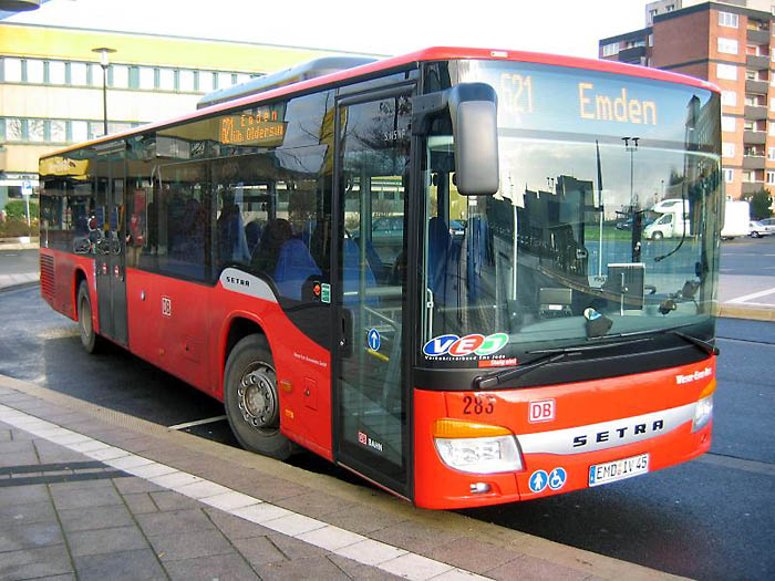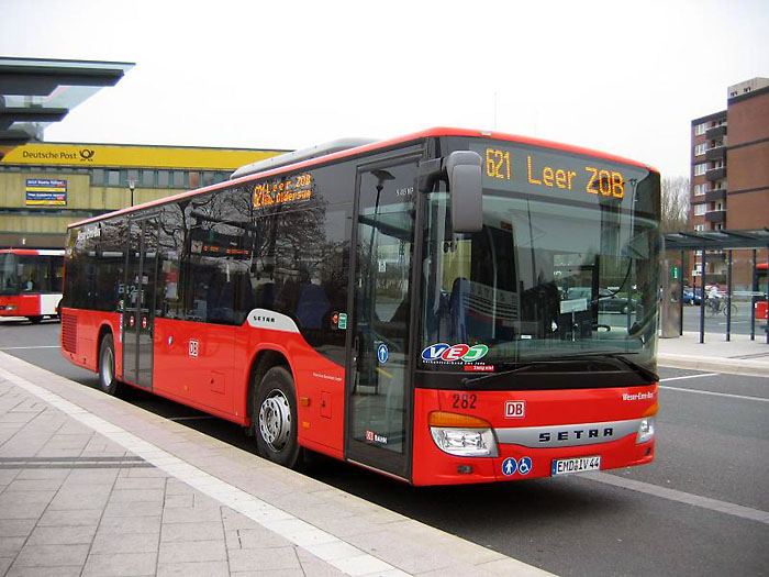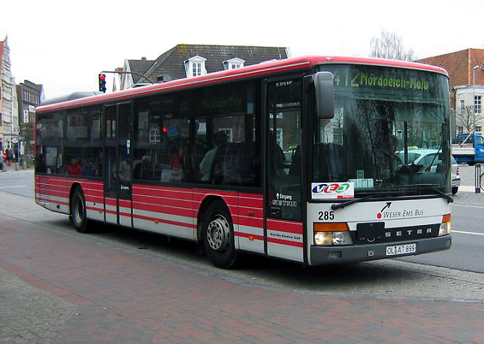 Bereits im Oktober 2008 hat der Emder Betriebshof der Weser-Ems Busverkehr GmbH (WEB) vier Setra S 415 NF im neuen DB-Design erhalten. Dabei handelt es sich um die Wagen 282 bis 285. Dafür wurden die Setra S 315 NF des Baujahres 1998 mit den Wagennummern 282, 284 und 285 ausgemustert. Wagen 284 ist allerdings noch als Einsteigerbus, eine Busschule, unterwegs. Die drei Bilder rechts zeigen die neuen Wagen 282 am 31.03.2009 sowie 283 am 06.12.2008 jeweils am Emder ZOB sowie den alten Wagen 285 am 10.04.2007 am Markt in Norden.