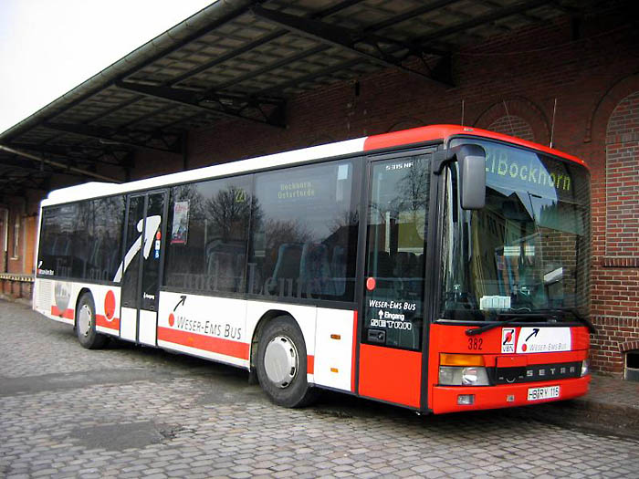 Auch in Oldenburg sind Ende letzten Jahres mit den Wagen 381 und 382 die ersten Fahrzeuge im neuen Design eingetroffen. Auch bei diesen handelt es sich um Setra S 415 NF. Ausgemustert wurden die beiden 1998 genauten Setra S 315 NF, die dieselben Wagennummern besaßen. Im Foto ist der alte Wagen 382 am 19.02.2006 am damals noch im alten Zustand befindlichen Bahnhof in Varel zu sehen.