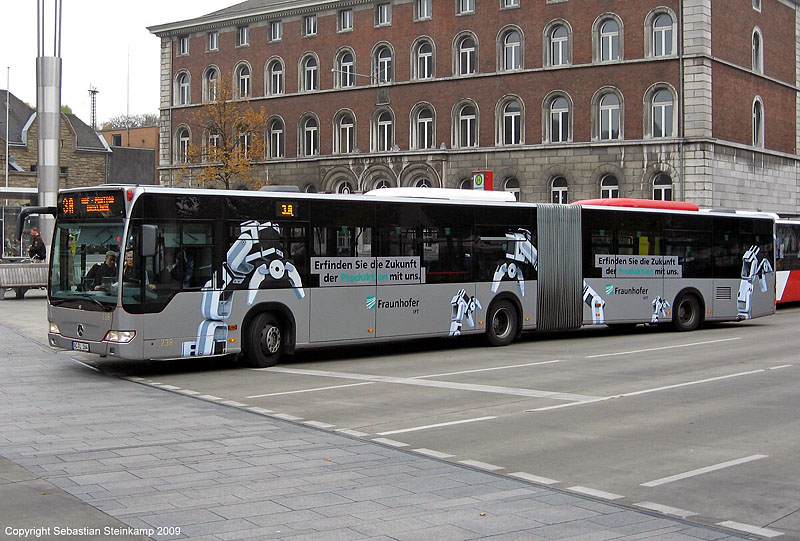 Im Rahmen des neu eingeführten "Liniensponsoring" kooperiert die Aachener Straßenbahn und Energieversorgungs-AG (ASEAG) mit dem Fraunhofer-Institut. Dazu tragen die Ringlinien 3A und 3B bereits seit dem Fahrplanwechsel im Juni den Namen "Fraunhofer-Linien". Seit 27.10.2009 werden die Fahrten auf diesen Linien von insgesamt sechs Fahrzeugen der Typen EvoBus MB O 530 und O 530 G (Citaro) durchgeführt, die ein spezielles Outfit erhalten haben. Die Ausweitung des Liniensponsoring auf weitere Linien ist in Planung. Das Foto zeigt Wagen 238 (Baujahr 2008) im neuen Fraunhofer-Design am 29.10.2009.