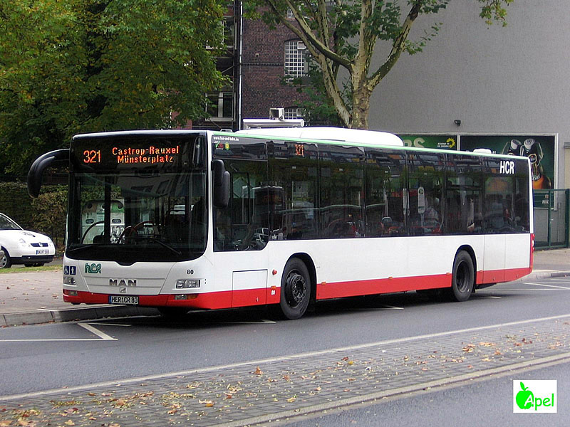 Zwischenzeitlich sind alle sechs bestellten MAN A21 (NL 273 Lion's City) bei der Straßenbahn Herne - Castrop-Rauxel GmbH (HCR) eingetroffen und zugelassen worden. Sie befinden sich seit einigen Tagen auch im Linieneinsatz. Die Wagen haben die Nummern 80 bis 85 (im Bild Wagen 80) mit den entsprechenden Kennzeichen HER-CR 80 bis 85 erhalten. Im Unterschied zu den bisherigen HCR-Fahrzeugen verfügt diese Serie erstmals über orangefarbene LED-Anzeigen. Die Neuwagen sind mit Motoren der EEV-Abgasnorm ausgestattet.