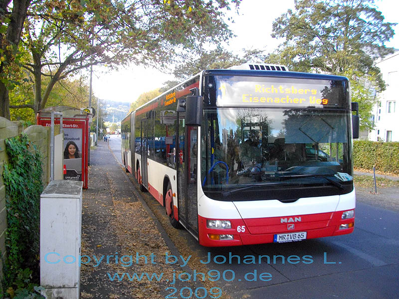 Die Stadtwerke Marburg GmbH (SWM) hat im Frühjahr 2009 einen neuen MAN A23 (Lion's City) beschafft. Der Gelenkbus hat das Kennzeichen MR-VB 65. Damit wurde erstmals seit einigen Jahren wieder ein Diesel-betriebener Bus in Dienst gestellt. Das Bild zeigt den Wagen am 18.10.2009 in der Friedrich-Ebert-Straße.