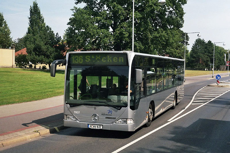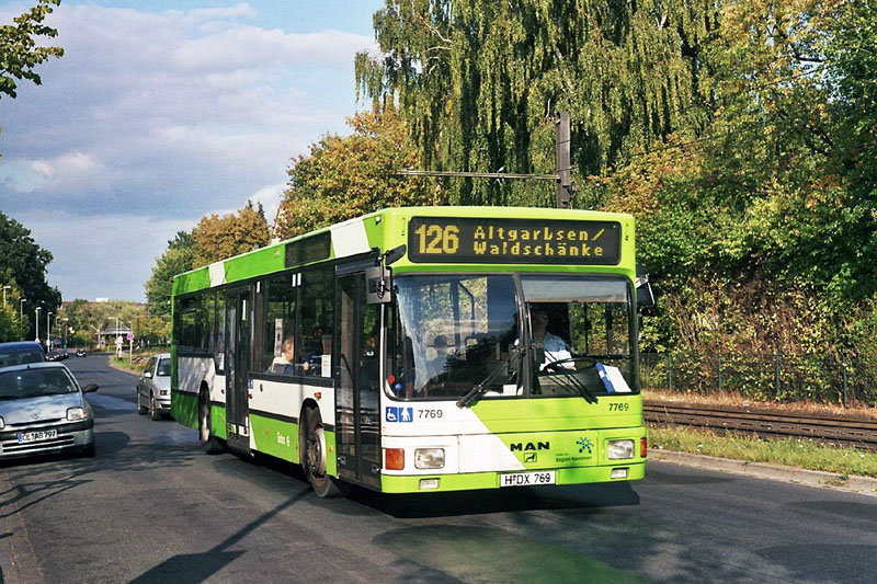 Von den MAN A10 (NL 202) standen Anfang Oktober noch folgende Wagen im Einsatz: 7763 bis 7766, 7769 bis 7778, 7780, 7781, 7784, 7785, 7788, 7789, 7801, 7810 bis 7812, 7815, 7820. Im Bild rechts innen ist der Wagen 7769 am 24.09.2009 auf der Weizenfeldstraße zu sehen. Alle verbliebenen MAN A10 (NL 202), die fünf Mercedes-Benz O 405 N2 (7830 bis 7834) sowie der einzige EvoBus MB O 530 (Citaro) im normalen Design (7837) - im Bild rechts außen am 15.08.2009 an den Herrenhäuser Gärten - gehören nun der Tochterfirma üstra-Reisen, ebenfalls die Irvine-Busse 7850 bis 7857 (7854 nur Fahrschule), 8211 bis 8216 und 9102, 9103. Die üstra-Reisen-Busse laufen im Auftragsverkehr auf Linien im Stadtrand-Bereich (126, 129/130, 136, 253, 340/341, 346, 363, 370, 390, 420, 440, 450, 480, 610/611, 631) gemischt mit Subunternehmer-Bussen und einzelnen Wagen der üstra.