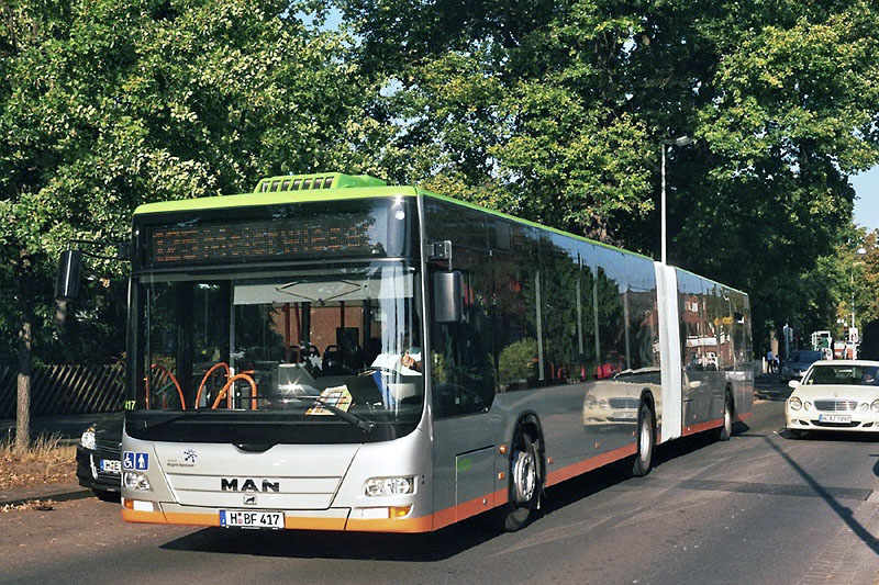 Im August/September wurden durch die üstra Hannoversche Verkehrsbetriebe AG neue Busse in Betrieb genommen. Im August wurden acht Solaris Urbino 12 als Wagen 7928 bis 7935 eingereiht, im September elf MAN A23 (NG 323 Lion's City) als Wagen 8408 bis 8418. Alle Fahrzeuge verfügen über EEV-Motoren, die Solowagen haben drei und die Gelenkbusse vier Türen. Die Aufnahme rechts innen zeigt den Wagen 8417 am 27.09.2009 an der Haltestelle Bothfeld Kirche.
