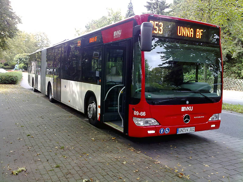 Die Fahrzeugbeschaffung 2009 der Verkehrsgesellschaft Kreis Unna mbH (VKU) ist abgeschlossen. Sechs Gelenkbusse vom Typ EvoBus MB O 530 G (Citaro) wurden in Dienst gestellt. Die Wagen 09-61 bis 09-63 erhielt der Betriebshof Lünen, die Wagen 09-64 bis 09-66 der Betriebshof Kamen. Die Neufahrzeuge wurden mit Klimaanlagen, Videoüberwachung und zwei TFT-Monitoren zur Fahrgastinformation ausgestattet. Der Antrieb erfolgt mit 299 PS starken Motoren der EEV-Abgasnorm, weiterhin ist ein Tagfahrlicht eingebaut. Die Fotos zeigen den Wagen 09-66 an der Haltestelle Heeren Denkmal auf der Linie R53.