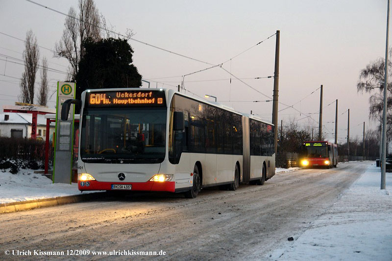 Die Stadtwerke Bonn GmbH (SWB) hat im November acht neue EvoBus MB O 530 G (Citaro) in Dienst gestellt. Die Gelenkbusse erhielten die Wagennummern 0901 bis 0908 und die Kennzeichen BN-SW 4387 bis 4394. Sie verfügen über Motoren der EEV-Abgasnorm, Klimaanlagen und Doppelbildschirme im Fahrgastraum. Das Bild zeigt den Wagen 0901 am 19.12.2009 an der Haltestelle Hersel Bahnhof.
