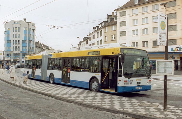Die beiden Aufnahmen zeigen den Wagen 253 am 27.09.2002. Auf dem linken Bild wartet der Van Hool AG 300 T am Graf-Wilhelm-Platz in Solingen auf seine Weiterfahrt nach Widdert, auf der rechten Aufnahme wartet der Gelenkobus an der Endstelle Hasselstraße auf Fahrgäste und seine Abfahrt nach Widdert. Das Wartehäuschen links wurde von Kindern der Gemeinschaft "Wir in der Hasseldelle e. V." bunt gestaltet.