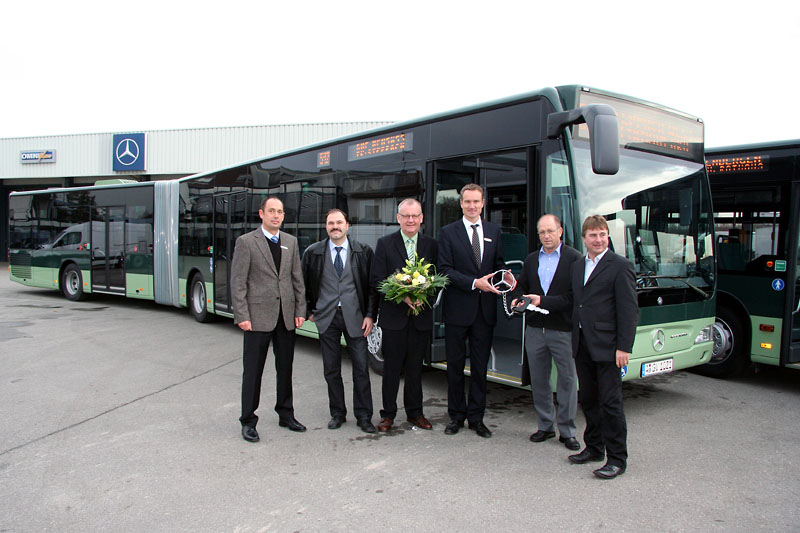 Die Gersthofer Verkehrsgesellschaft mbH (51% Schwaben Mobil Nahverkehr Service GmbH / 49% Stadt Gersthofen) hat Ende 2009 zwei neue EvoBus MB O 530 G (Citaro) in Betrieb genommen. Die Fahrzeuge mit den Nummern 121 und 122 fallen durch ein modernisiertes Lackschema und einen frischer gestalteten Inennraum auf. Der Komfort wurde außerdem durch die teilweise Verwendung von Überlandsitzen weiter gesteigert. Für die Fahrgastinfo sorgen je Bus zwei Monitore von Gorba. Das Foto von Mercedes-Benz zeigt die feierliche Übergabe der beiden Gelenkbusse in der Mercedes-Benz-Niederlassung Augsburg.