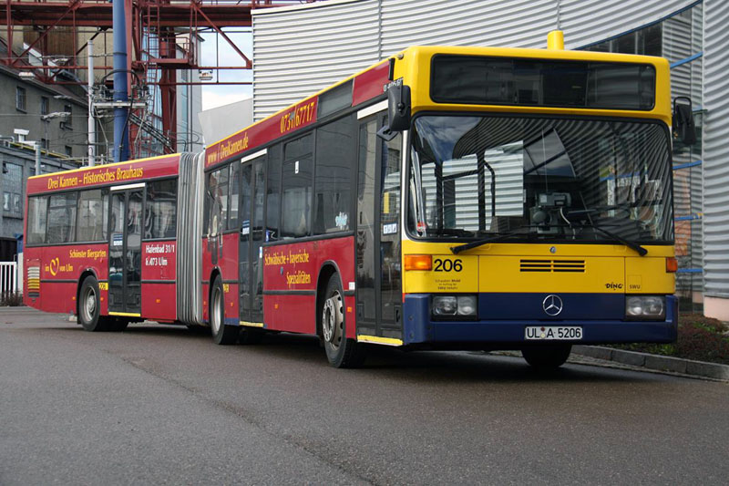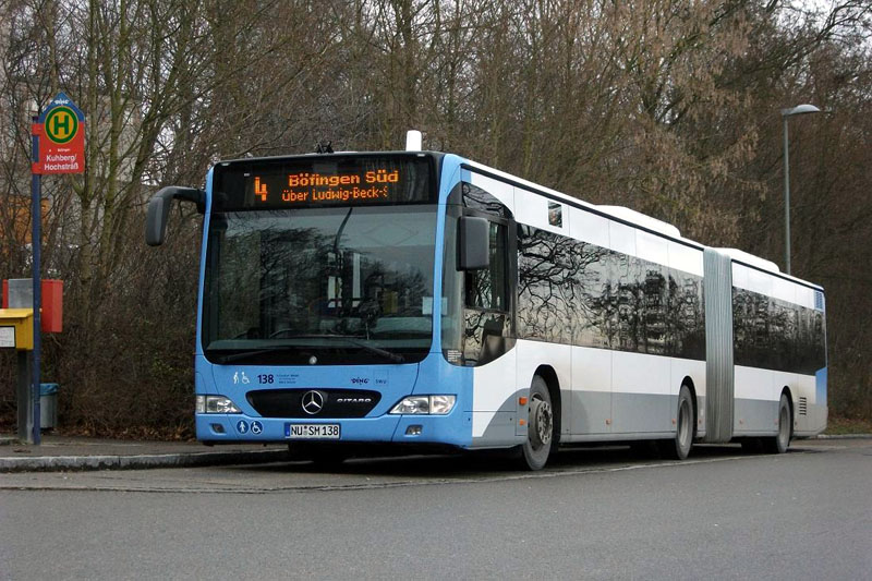 Für den Auftragsverkehr bei den Stadtwerken Ulm hat die Schwaben Mobil Nahverkehr Service GmbH Ende November und Anfang Dezember sechs neue Gelenkbusse vom Typ EvoBus MB O 530 G (Citaro) beschafft. Die Wagen wurden auf NU-SM 137 bis 142 zugelassen. Im Ausgleich haben bisher fünf der noch 12 vorhandenen EvoBus MB O 405 GN2 den Fuhrpark verlassen (Wagen 206, 212, 213, 215 und 216). Die Aufnahmen zeigen mit Wagen 138 einen der neuen Busse an der Endhaltestelle "Kuhberg - Am Hochsträß" sowie mit Wagen 206 einen der ausgeschiedenen Busse.