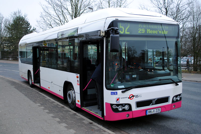 Ein Volvo 7700 Hybrid Testbus fährt seit Mitte Januar durch Bremen. Er ist auf den Linien 29/52 im Einsatz und hat das Kennzeichen HN-V 235. Der Bus mit der Wagennummer 4487 wird noch bis Februar bei der BSAG sein. Der Hybridbus ist im Bild rechts oben zu sehen.