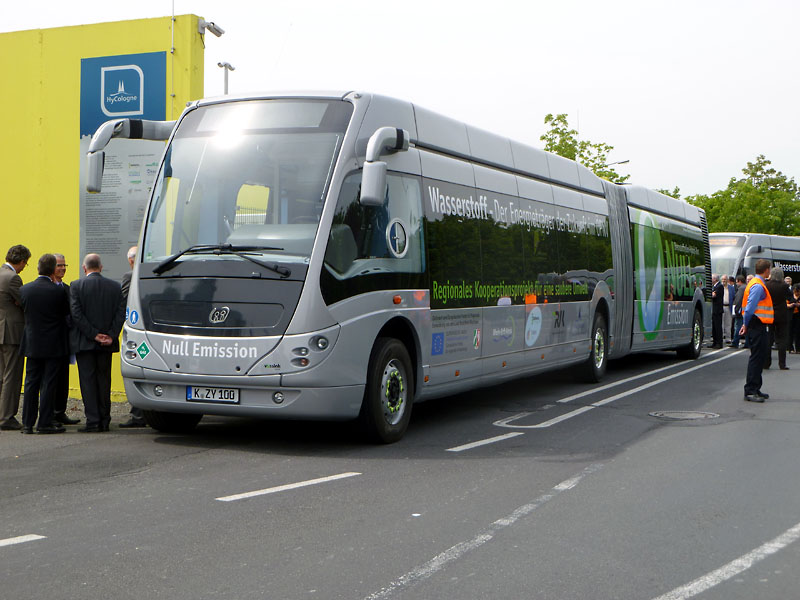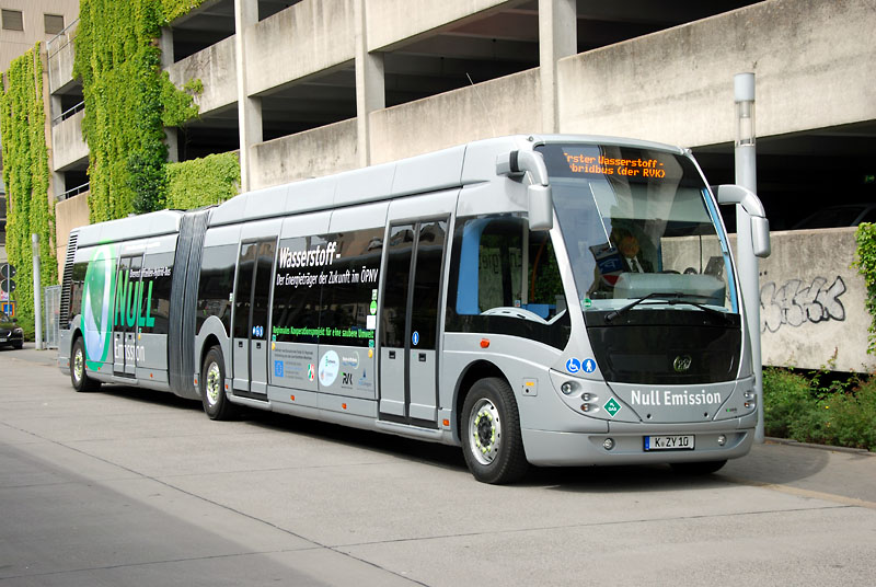 Mit einer Präsentation, die in großem Rahmen begangen wurde, nahm die Regionalverkehr Köln GmbH (RVK) am 06.05.2011 ihre beiden ersten Brennstoffzellen-Hybridbusse des Herstellers APTS (Tochterunternehmen des niederländischen VDL-Konzerns) vom Typ Phileas 18 BZ in Betrieb. Die Wagen tragen die Betriebsnummern 10 (K-ZY 10) und 100 (K-ZY 100). Die Brennstoffzellen beider Wagen stammen vom kanadischen Hersteller Ballard, das Hybridsystem von Vossloh Kiepe aus Düsseldorf. Beim Bremsen rückgewonnene Energie wird sowohl in Ultracaps des Herstellers Maxwell als auch in Nickel-Metall-Hydrid-Batterien von Hoppecke gespeichert. Insgesamt hat APTS jetzt vier dieser Wagen ausgeliefert; die beiden anderen gingen an den GVBA in der niederländischen Hauptstadt Amsterdam. Die Fotos zeigen Wagen 10 bei der Präsentation im Busbahnhof Hürth-Mitte und Wagen 100 an der Wasserstoff-Tankstelle.