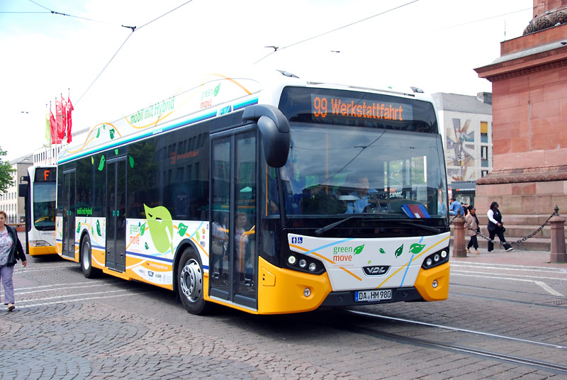 Die HEAG mobilo GmbH aus Darmstadt hat unter den Wagennummern 980 bis 982 drei Hybridbusse vom Typ Citea SLF-120 hybrid des niederländischen Herstellers VDL in Dienst gestellt. Die 12 Meter langen Dreitürer sollen auf der Linie L (Heinheimer Strasse - Ostbahnhof) zum Einsatz kommen. Die Wagen sind nicht nur die ersten VDL-Hybridbusse in Deutschland, sondern zugleich auch die ersten Stadtbusse vom Typ Citea, die der Hersteller nach Deutschland liefern konnte. Das Foto zeigt Wagen 980 auf einer Schulungsfahrt auf dem Luisenplatz, dem zentralen Punkt im Darmstädter Liniennetz.