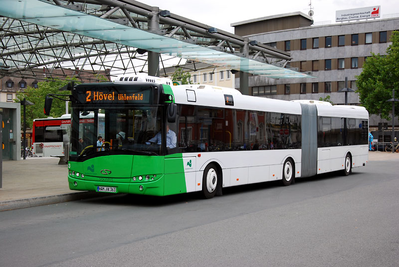 Im Juli 2011 stellte die Stadtwerke Hamm GmbH vier Solaris Urbino 18 unter den Betriebsnummern 63 bis 66 in Dienst. Sie sind die ersten Solaris der Stadtwerke Hamm, deren Wagenpark sich damit jetzt aus Fahrzeugen der drei Hersteller MAN, Neoplan, Volvo und Solaris zusammensetzt. Das Foto zeigt den neuen Wagen 63 am 10.08.2011 an der Haltestelle Hauptbahnhof.