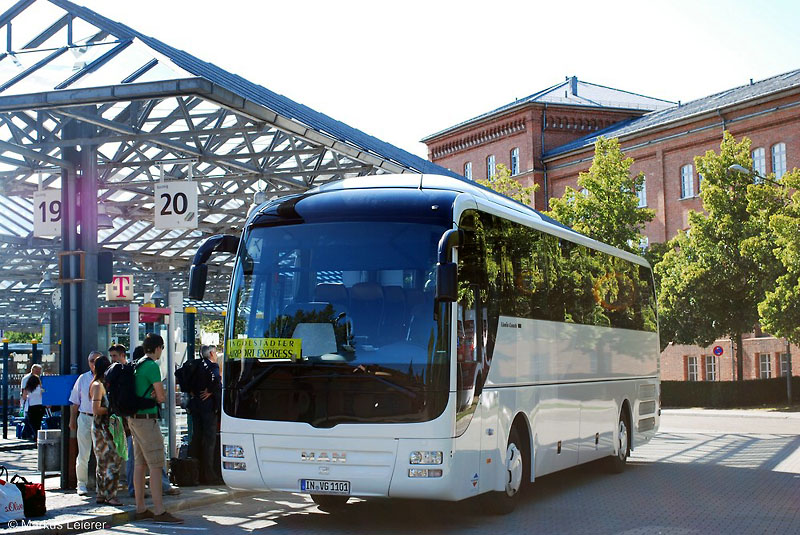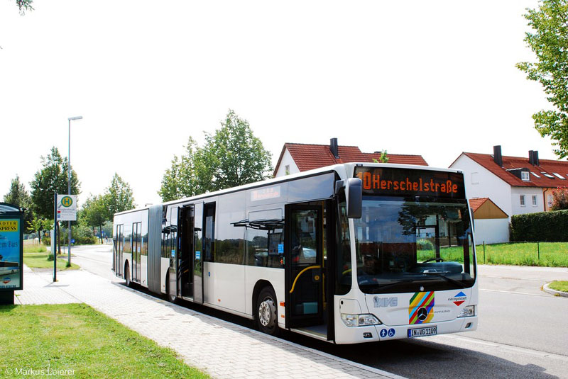 Die KVB Ingolstadt GmbH hat dieses Jahr vier EvoBus MB O 530 G (Citaro) sowie einen Reisebus des Typs MAN Lion's Coach erhalten. Zugleich wurde ein neues Nummernsystem eingeführt, bei dem die ersten beiden Zahlen das Baujahr sind. Der Reisebus, der im linken Bild zu sehen ist, erhielt die Wagennummer 1101. Die Gelenkbusse werden als Wagen 1106 bis 1109 geführt, von denen die mittlere Aufnahme den Wagen 1109 zeigt.