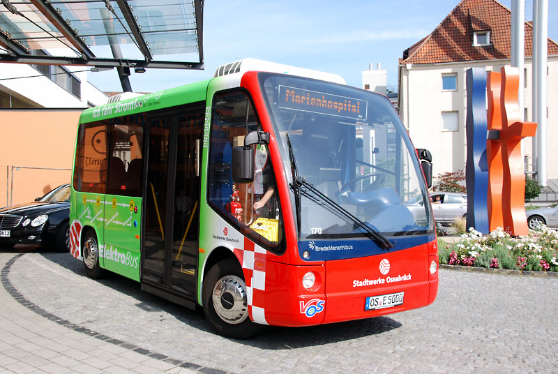 Mit dem Fahrplanwechsel zum Beginn des neuen Schuljahrs am 18.08.2011 eröffnete die Stadtwerke Osnabrück AG eine neue Linie, die das Marienhospital mit der Zentralhaltestelle Neumarkt verbindet und zum Teil durch die Fußgängerzone führt. Für diese Linie wurde ein batteriebetriebener Elektro-Midibus des italienischen Herstellers BredaMenarinibus vom Typ M 200 E Zeus beschafft (Zeus = Zero Emmission Urban System). Der Wagen trägt die Wagennummer 170 und wurde auf das Kennzeichen OS-E 5000 zugelassen. Interessant mag noch sein, dass die Batterie, ein südkoreanisches Produkt, dem Wagen eine Reichweite von 120 Kilometern verleiht. Das Foto zeigt Wagen 170 bei der Pressevorstellung am 17.08.2011 am Marienhospital.