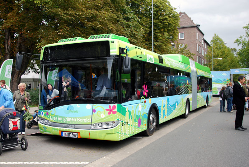 Mit einem "Südstadtfest" auf dem Bertha-von-Suttner-Platz präsentierte die üstra Hannoversche Verkehrsbetriebe AG am 18.09.2011 zehn neue Solaris Urbino 18 Hybrid Gelenkbusse. Die Wagen mit den Betriebsnummern 8301 bis 8310 verfügen über einen Hybridantrieb des Typs "EP 50" von Allison, als Dieselmotor ist der "ISB 6.7 E 5-250 H" von Cummins eingebaut, der 181 kW (246 PS) leistet. Hannovers neue Hybridbusse kommen seit dem 19.09.2011 auf der Linie 121 (Altenbekener Damm - Hauptbahnhof - Niedersachsenring - Haltenhoffstrasse) zum Einsatz, die damit nach der Linie 390 der Bogestra Deutschlands zweite Buslinie ist, die ausschließlich mit Hybridbussen bedient wird (übrigens wie auch in Bochum ausschließlich mit Hybridbussen von Solaris). Das Foto zeigt den Wagen 8309 bei der Präsentation zum "Südstadtfest" auf dem Bertha-von-Suttner-Platz.