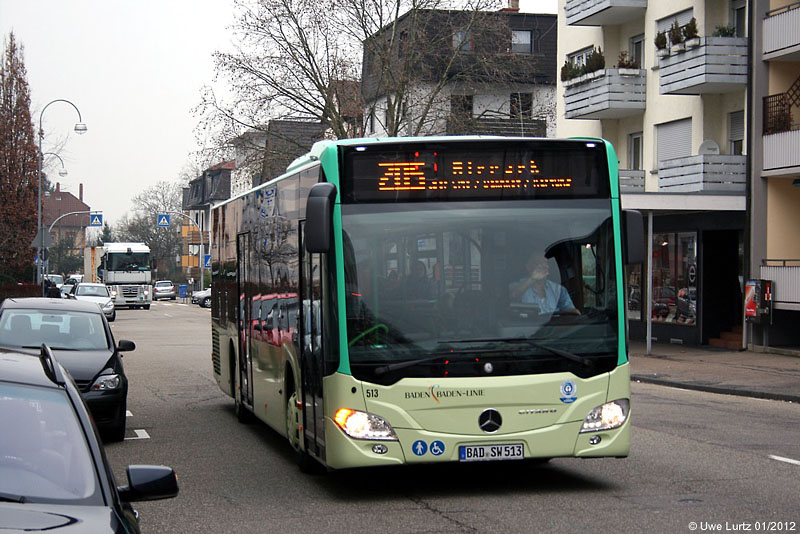 Anfang Januar erhielten die Stadtwerke Baden-Baden zwei neue Solobusse des Typ EvoBus MB O 530 C2 (Citaro). Sie besitzen die Wagennummern 512 und 513 mit den entsprechenden Kennzeichen BAD-SW 512 und 513. Die Haltestangen der neuen Busse sind nun grün, die Sitzbepolsterung besteht aus einem bunten Mix aus verschiedenen Farben, vor allem Gelb und Rot.