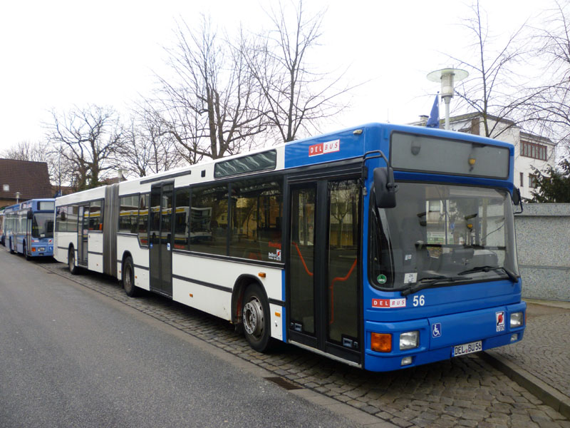Die Delbus GmbH & Co. KG aus Delmenhorst setzt seit Ende Februar einen gebraucht gekauften MAN A11 (NG 312) ein. Der Gelenkbus erhielt die Wagennummer 56 und das Kennzeichen DEL-BU 56. Er fährt von 6.53 bis 8.50