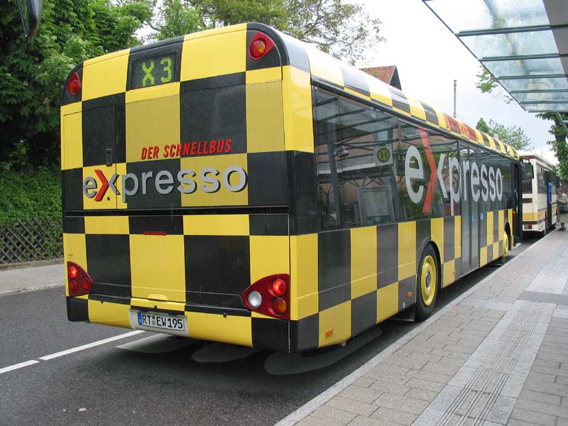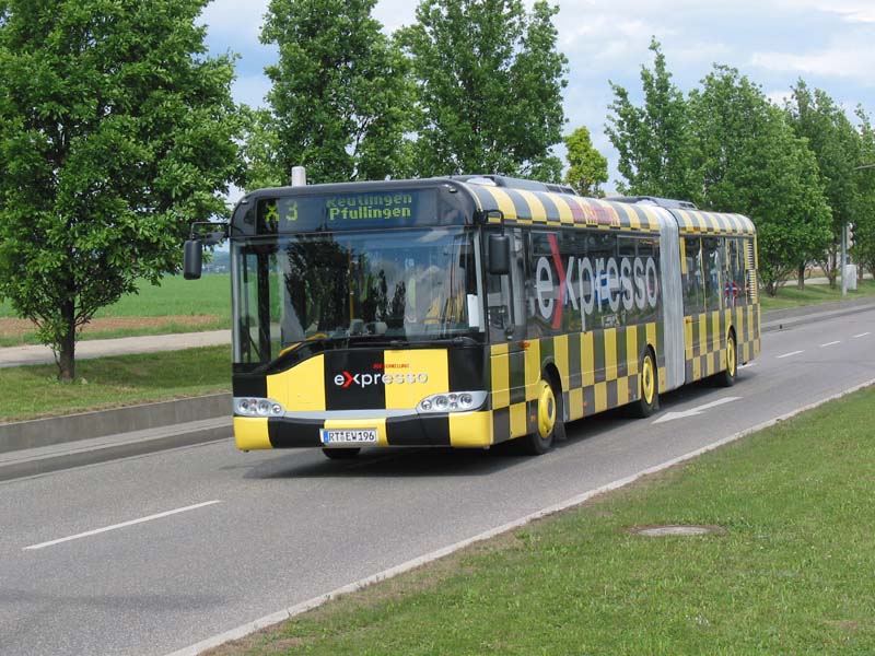 Die vier neuen Solaris Urbino sind am späten Abend des 27.04.2003 auf dem Betriebshof in Reutlingen eingetroffen. Drei der Fahrzeuge sind für die Flughafenlinie Pfullingen - Reutlingen - Flughafen Stuttgart ("eXpresso") vorgesehen, welche ab dem 14.05.2003 verkehren wird. Bei den neuen Omnibussen handelt es sich um zwei Urbino 18 (einer davon mit Überlandausstattung, Aussenschiebetüren, Kaffeemaschine, Gepäcknetz) und zwei Urbino 12 ebenfalls in Überlandausstattung. In den nächsten Tagen werden die Busse noch wie "Follow me"-Autos auf den Flughäfen beklebt und einsatzbereit gemacht. Die Zulassungen lauten RT-EW 194 bis RT-EW 197, wobei die genaue Zuordnung noch nicht bekannt ist.