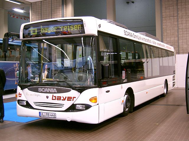 Nach den ersten drei Scania OmniCity in Deutschland für die Firma Hagro (vgl. Meldung vom 13.11.2004) ging auch der erste Scania CL94UB 4x2 OmniLink in Deutschland an ein privates Unternehmen in Baden-Württemberg. Die Robert Bayer GmbH & Co. KG in Ehingen/Donau stellte den auf dem Low-Entry-Fahrgestell L94 basierenden Bus mit dem Kennzeichen UL-RB 446 in Dienst. Die Firma Bayer hat bereits umfangreiche Erfahrung mit Scania-LKW in der angeschlossenen Tankspedition. Der neue Low-Entry-Bus wird im Stadtverkehr von Ehingen zum Einsatz kommen. Das Foto zeigt das Fahrzeug ausgestellt auf dem WBO-Busforum-Workshop am 03.12.2004 auf dem Stuttgarter Messegelände.