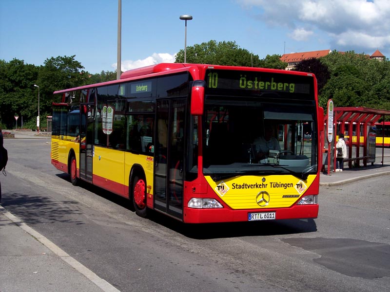 Das Foto zeigt mit RT-L 6011 einen der beiden neuen Citaros im Einsatz auf der Stadtverkehrslinie 10 am Tübinger Omnibusbahnhof.