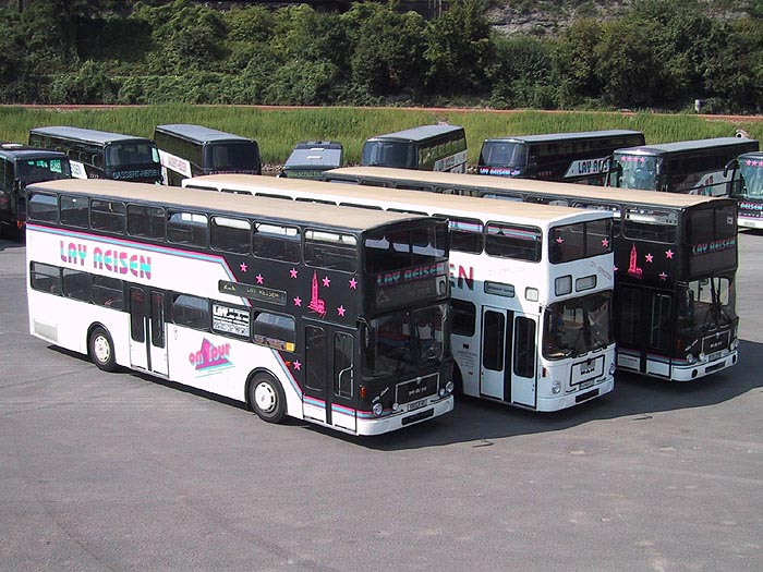Lay Reisen hat zwei weitere Busse im Einsatz: Wagen SB-LR 405 ist ein Mercedes-Benz O 405 N und wird meist auf der Gemeinschaftslinie mit der RSW nach Riegelsberg (Saarbahnzubringer) eingesetzt. Wagen SB-LR 777 ist ein ehemals Berliner Liniendoppeldecker und wird als Ersatzwagen für die im Ringbus eingesetzten MAN NM 223 benutzt. Die Aufnahme zeigt diesen Wagen zwischen zwei Fahrzeugen des gleichen Typs.