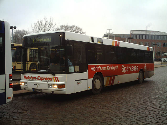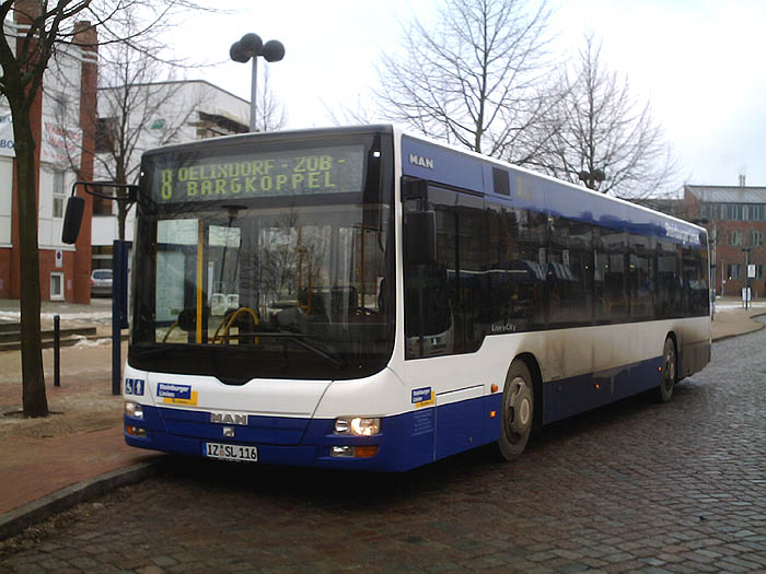 Seit 01.01.2006 ist der Itzehoer und Glückstädter Stadtverkehr in den Händen der neuen Connex-Tochter Nord-Ostsee-Bus GmbH, die mit dem Marke "Steinburger Linien" auftritt. Eingesetzt werden 11 Busse (acht Solo- und drei Gelenkfahrzeuge). Bislang sind fünf MAN A21 (Lion's City) ausgeliefert, ein weiterer soll in Kürze folgen. Auf den ersten beiden Bildern sind von diesen Neufahrzeugen die Wagen mit den Zulassungen IZ-SL 116 und 166 zu sehen.