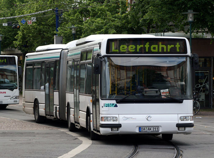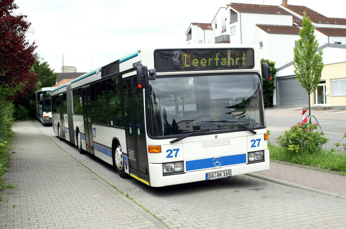 Seit einiger Zeit laufen zwei gebraucht übernommene Mercedes-Benz O 405 GN für die HAV in und um Darmstadt. DA-AK 164 trägt noch die Lackierung des Vorbesitzers, den Stadtwerken Münster, DA-AK 165 ist schon an das HAV-Outfit mit der Wagennummer 27 angepasst worden. Weiterhin setzt die HAV einen Renault Agora-Gelenkwagen mit Klimaanlage und dem Kennzeichen DA-AK 211 ein.